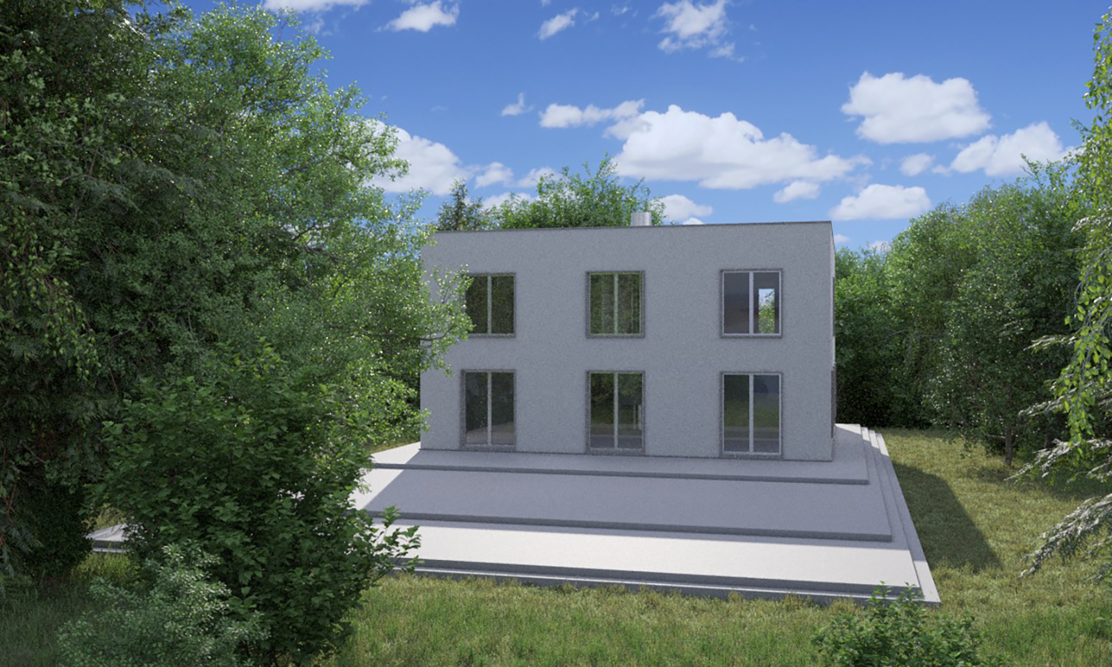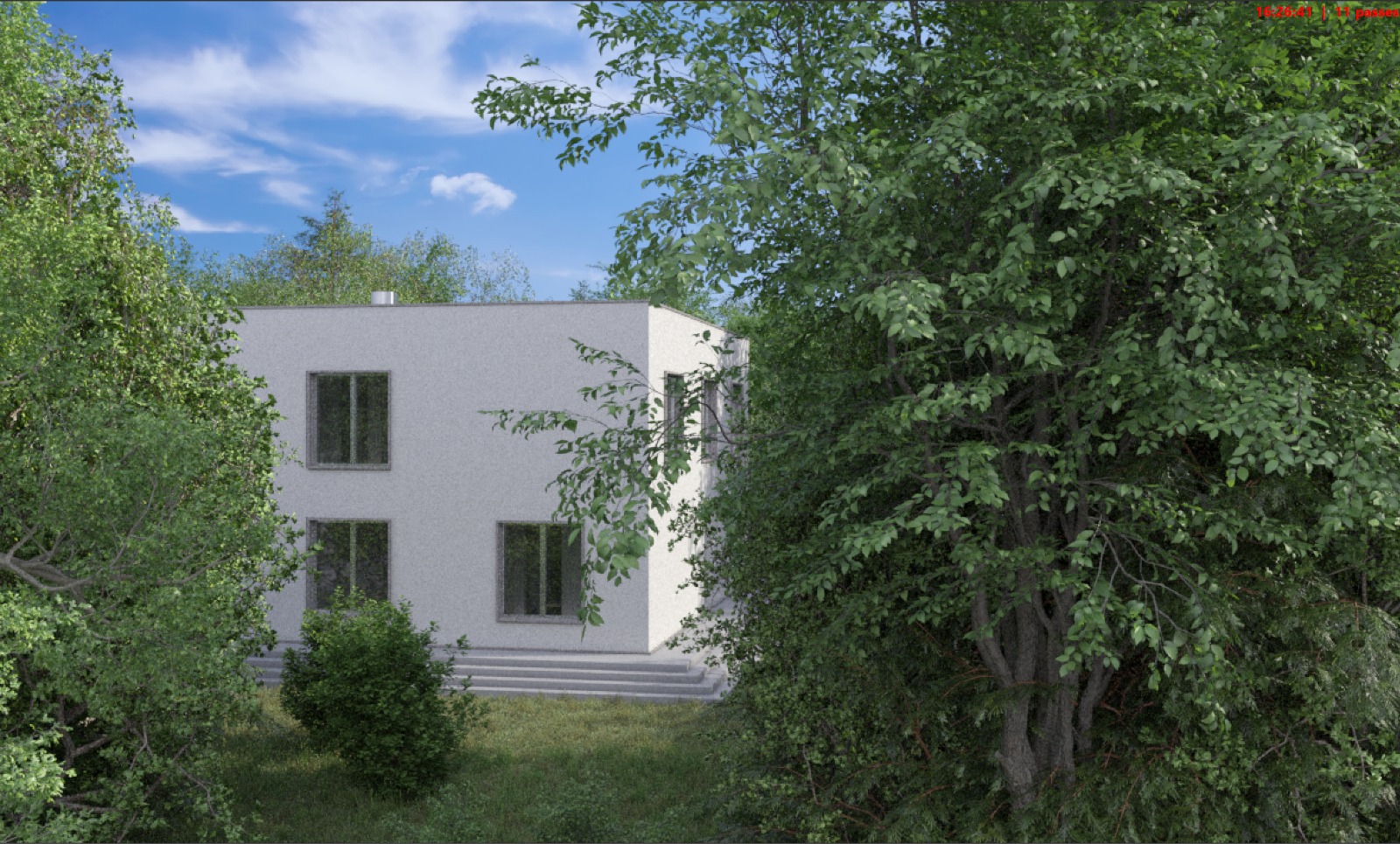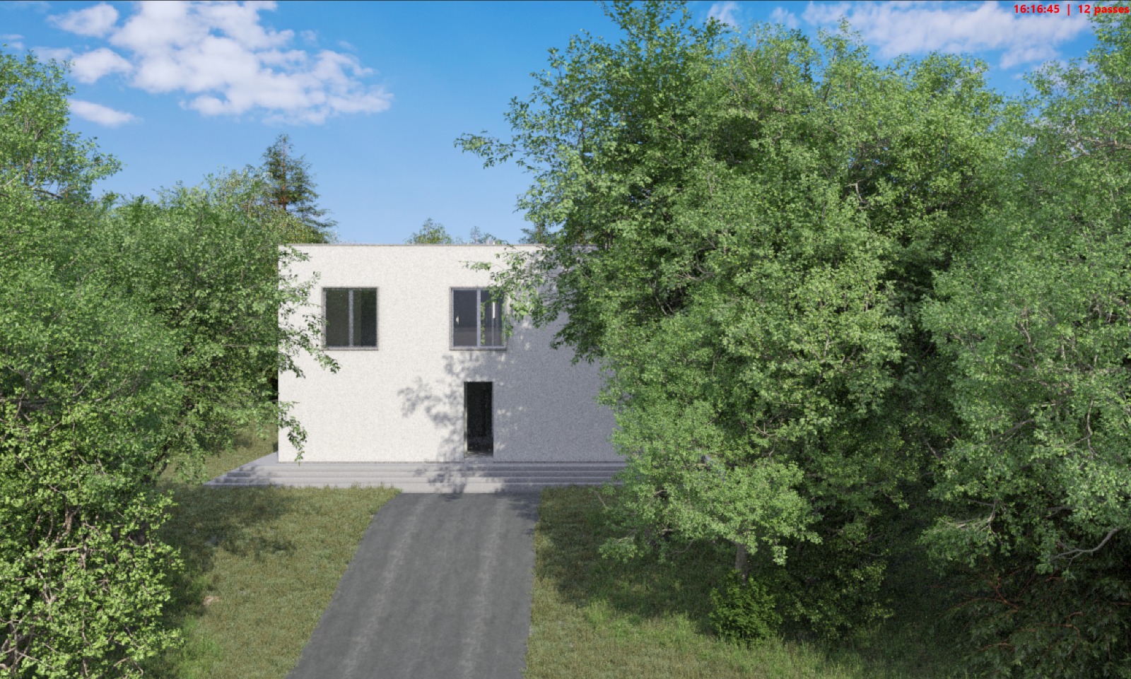 -Three building facades: Stucoflex facade, charred wood facade, cinder block facade